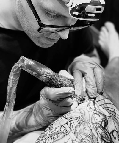 HIS FOCUS IS WORKING CLOSELY WITH CLIENTS TO DESIGN BOLD, ILLUSTRATIVE CUSTOM TATTOOS THAT FLOW WITH THE HUMAN FORM AND ANATOMY.